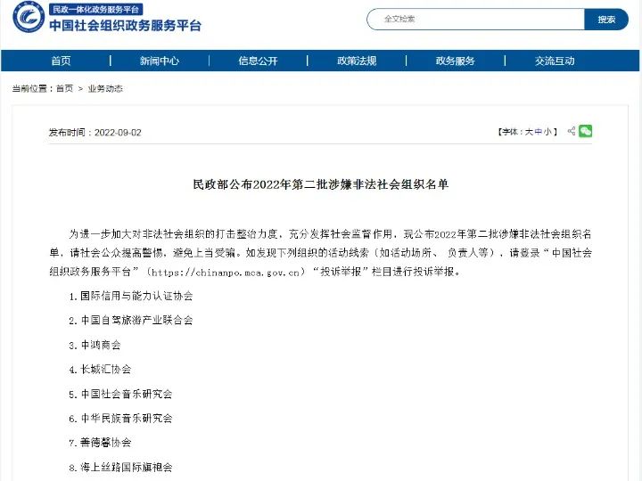 民政部2日公布2022年第二批涉嫌非法社会组织名单,包括国际信用与能力认证协会等8家。这8家涉嫌非法社会组织包括国际信用与能力认证协会、中国自驾旅游产业联合会、中鸿商会、长城汇协会、中国社会音乐研究会、中华民族音乐研究会、善德馨协会、海上丝路国际旗袍会。民政部提醒广大社会公众提高警惕,避免上当受骗,如发现上述组织活动场所、负责人等活动线索,可投诉举报。