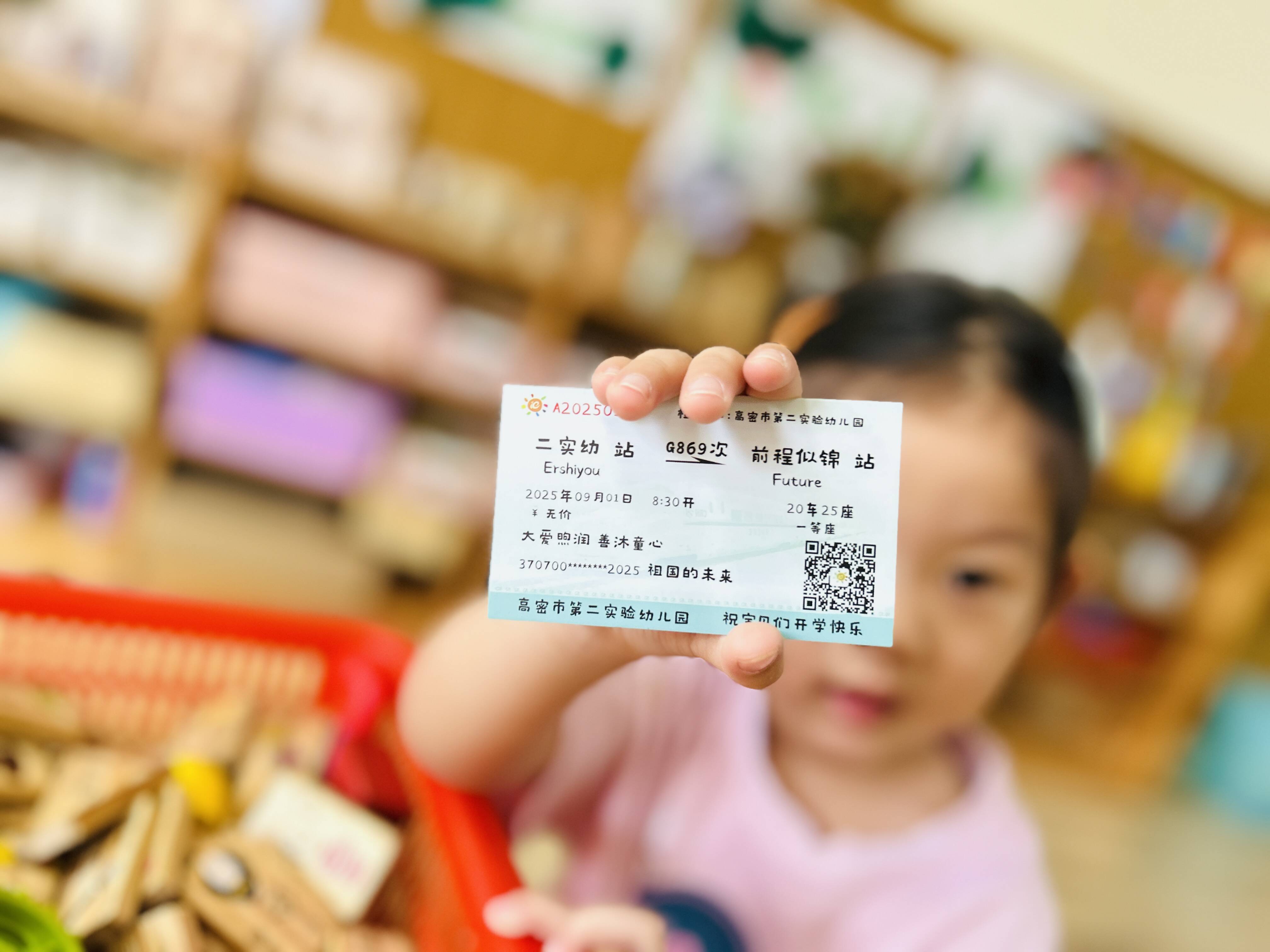 9月1日上午,高密市第二实验幼儿园开展 “初秋相见,共赴成长” 开学仪式,幼儿园门口装扮一新,教师以笑容、拥抱迎接孩子,小班小朋友得到了一张启程车票,一起开启新的学期。