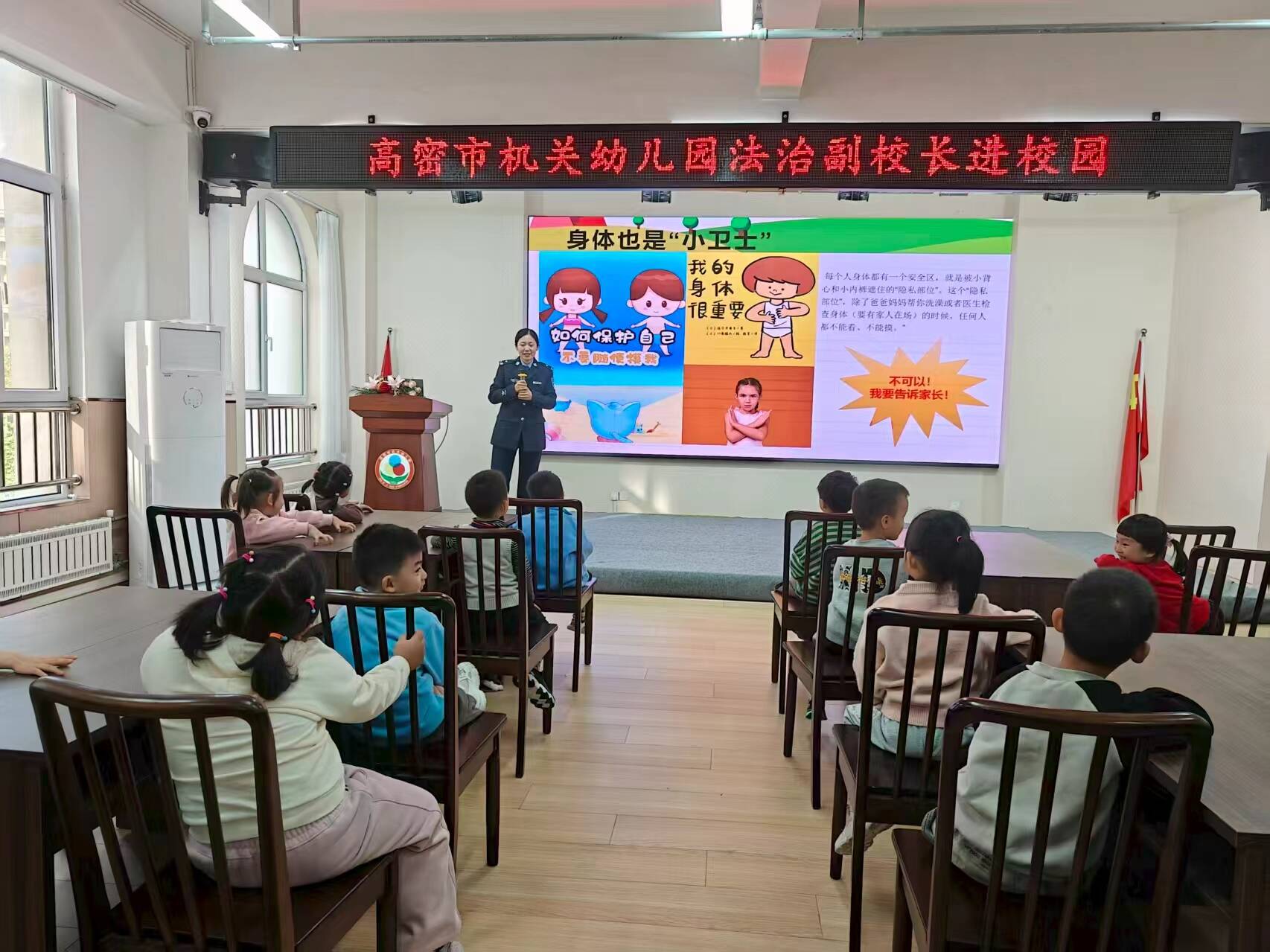 为进一步强化幼儿安全防护意识,筑牢校园安全防线,10月23日下午,高密机关幼儿园特邀法治副校长走进校园,开展以 “交通安全 + 防溺水安全” 为主题的安全教育活动。