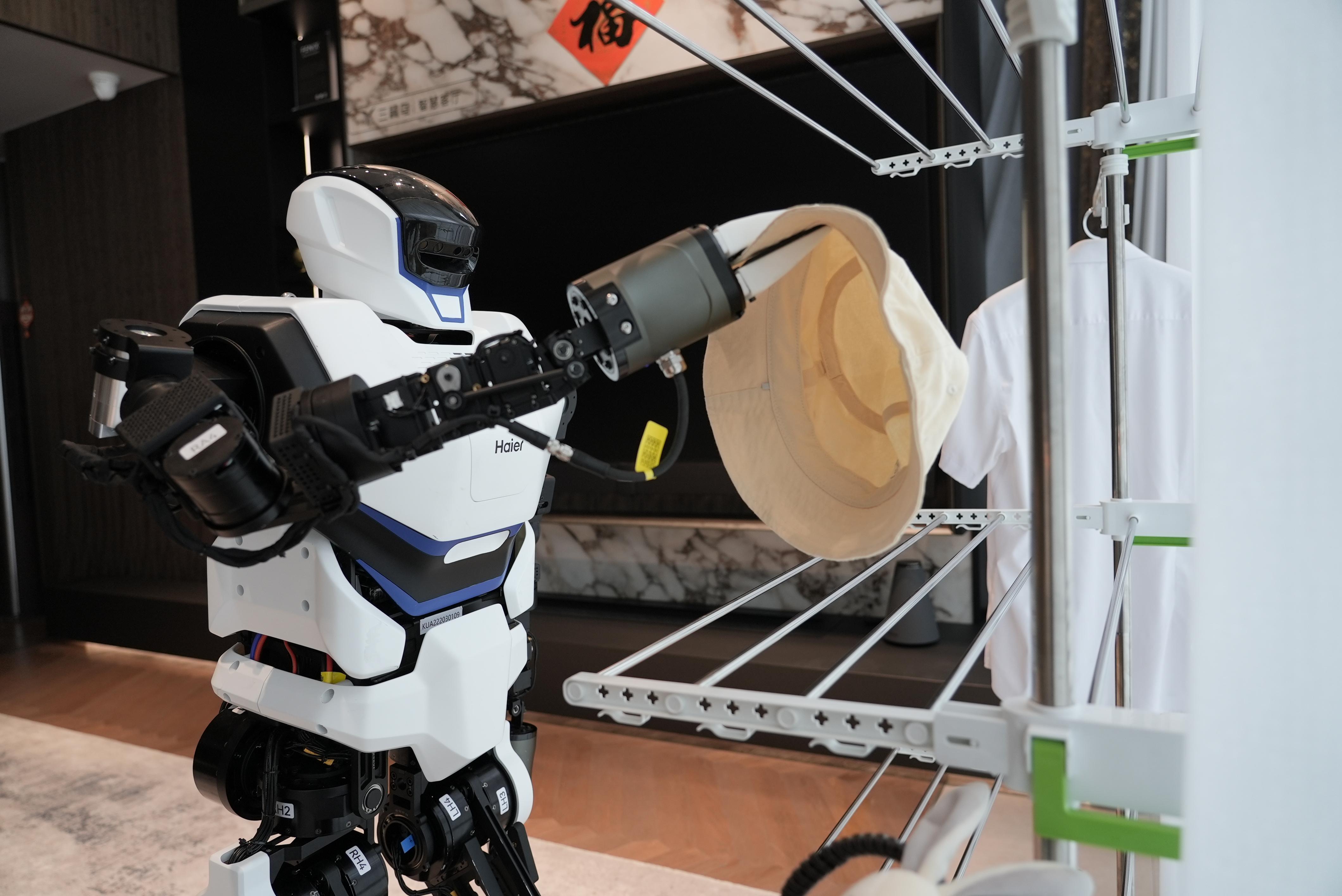 乐聚夸父机器人正在晾晒帽子,这是其在海尔家庭场景上的应用。受访者供图