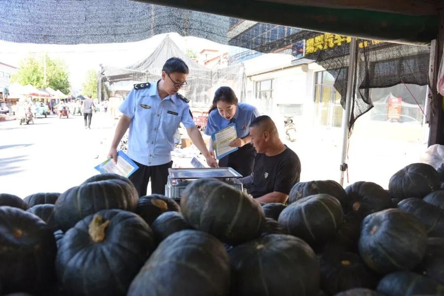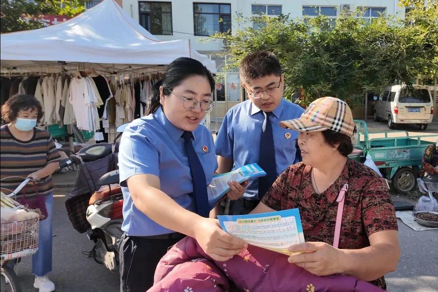 9 月 18 日,高密市检察院联合高密市公安局、高密市市场监督管理局、高密市农业农村局,走进高密市夏庄大集,开展以“严打伪劣化肥,守护农产质量,共筑丰收希望”为主题的农资质量月普法宣传活动,为农民丰收保驾护航。