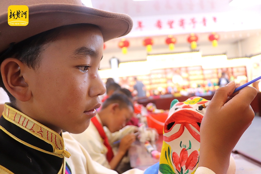 2025年9月25日,在山东省高密市姜庄镇,西藏南木林县的小学生在给“泥叫虎”上色。