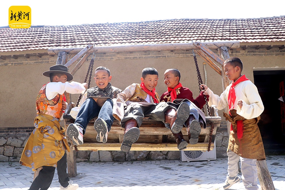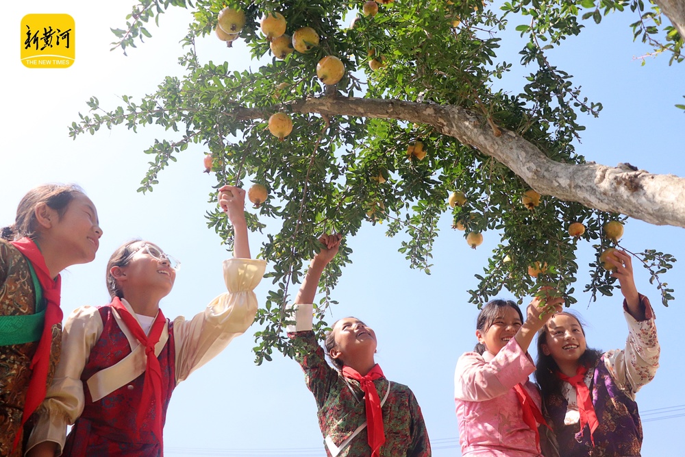 2025年9月25日,在山东省高密市姜庄镇,西藏南木林县的小学生在石榴树下玩耍。