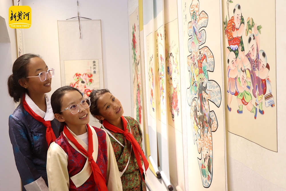 2025年9月25日,在山东省高密市姜庄镇,西藏南木林县的小学生在欣赏当地非遗“扑灰年画”。