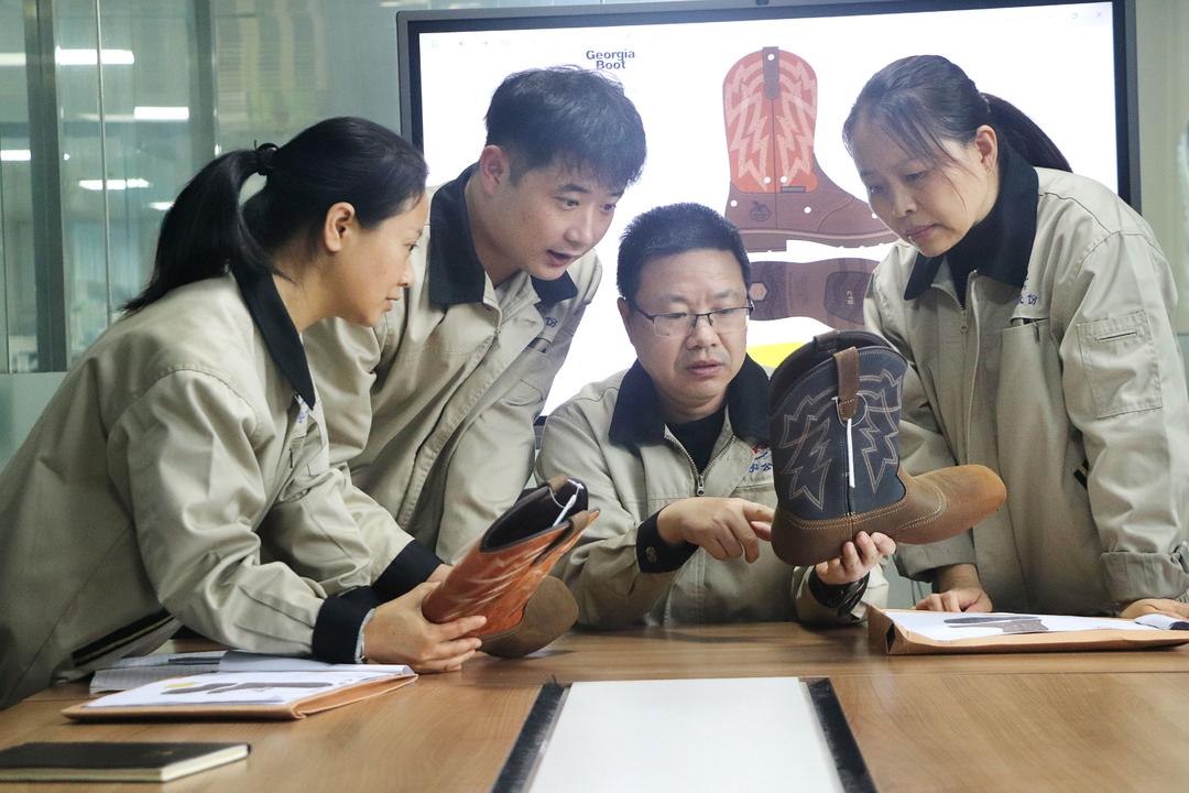 10月12日,在山东省高密市海宇股份有限公司生产车间内,设计师在讨论鞋样。
