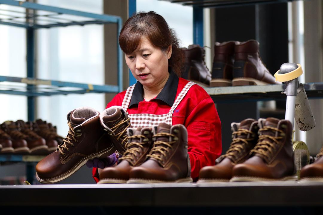 10月12日,在山东省高密市海宇股份有限公司,质检员在检查安防鞋质量。