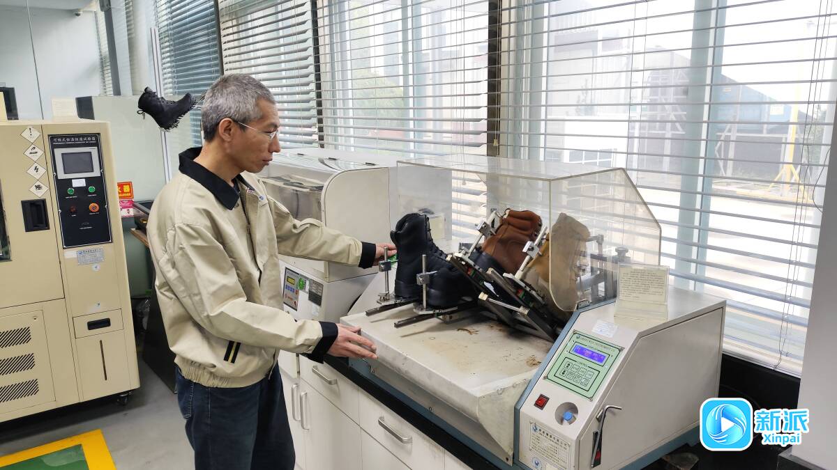 海宇股份有限公司质检员使用专用设备检测安防鞋质量。