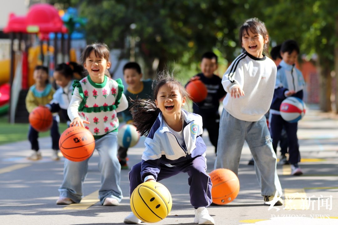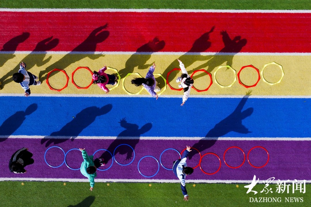 10月21日,高密市金苹果幼儿园,小朋友在和煦阳光中进行拍球、跳绳、跑酷、跳圈等多种自主活动,乐享阳光大课间,在体育运动和趣味游戏中锻炼身体、愉悦身心,健康成长。