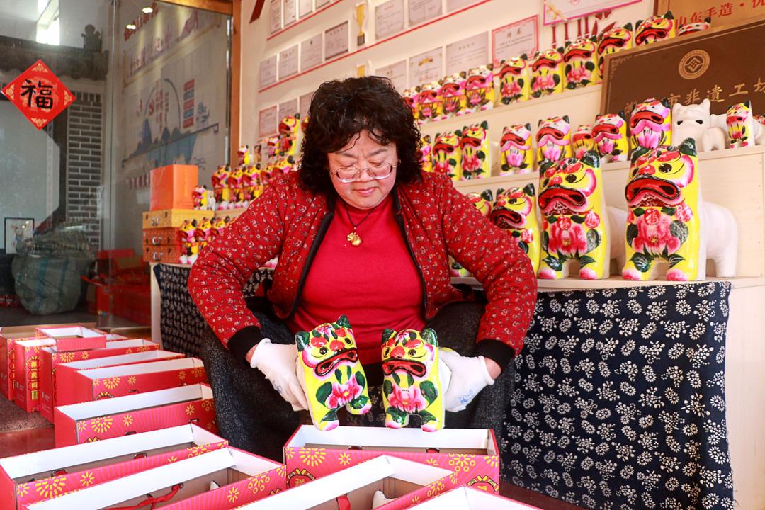 12月26日,在山东省高密市姜庄镇聂家庄村,村民将“泥叫虎”装箱准备发货。