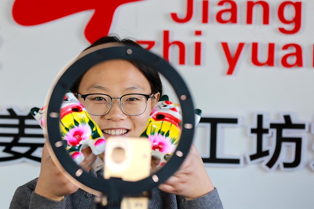 “00后”泥塑艺人聂秀杰通过线上方式推销“泥叫虎”产品。