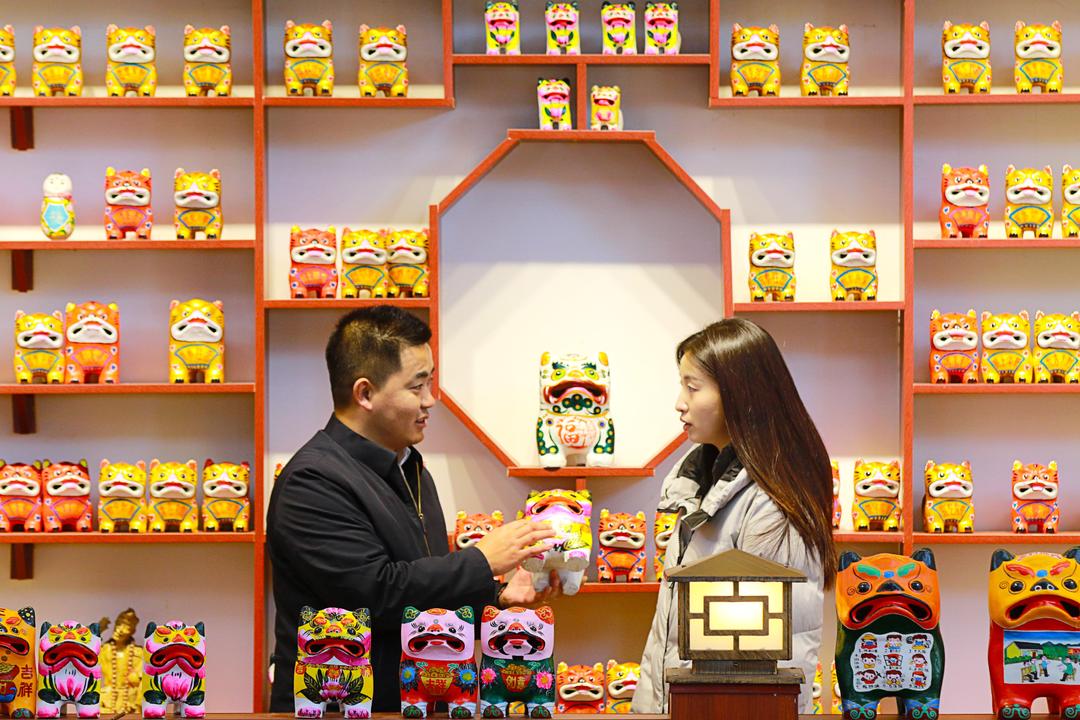 12月26日,在山东省高密市姜庄镇聂家庄村,泥塑艺人聂鹏在向客户推销“泥叫虎”产品。