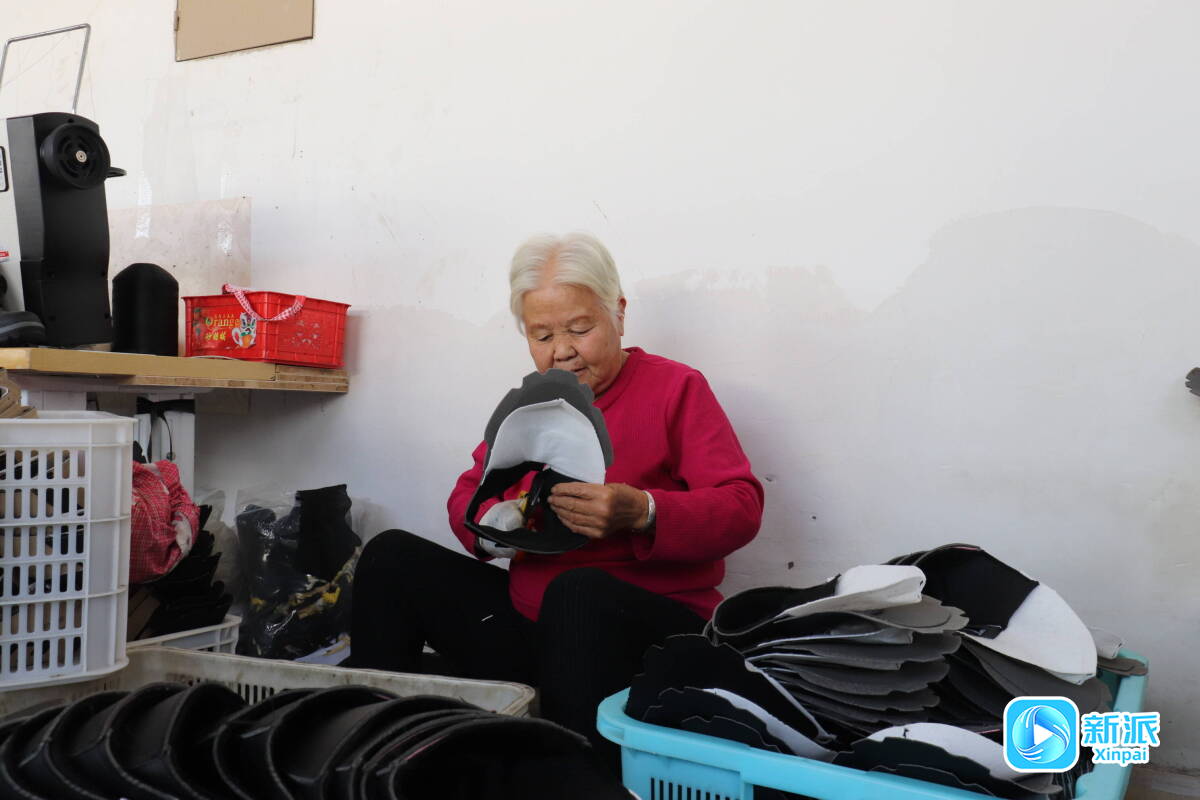 “鞋帮富”共富工坊里,张兰花正在修剪鞋帮线头。