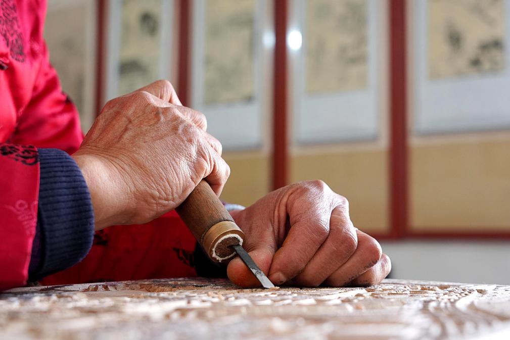 10日、山東省高密市の朱家村で版木を彫刻する高密木版年画の代表的伝承者、斉伝新(せい・でんしん)さん。(高密=新華社配信/李海濤)
