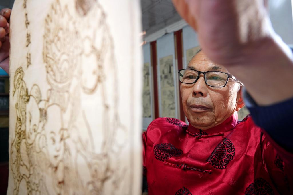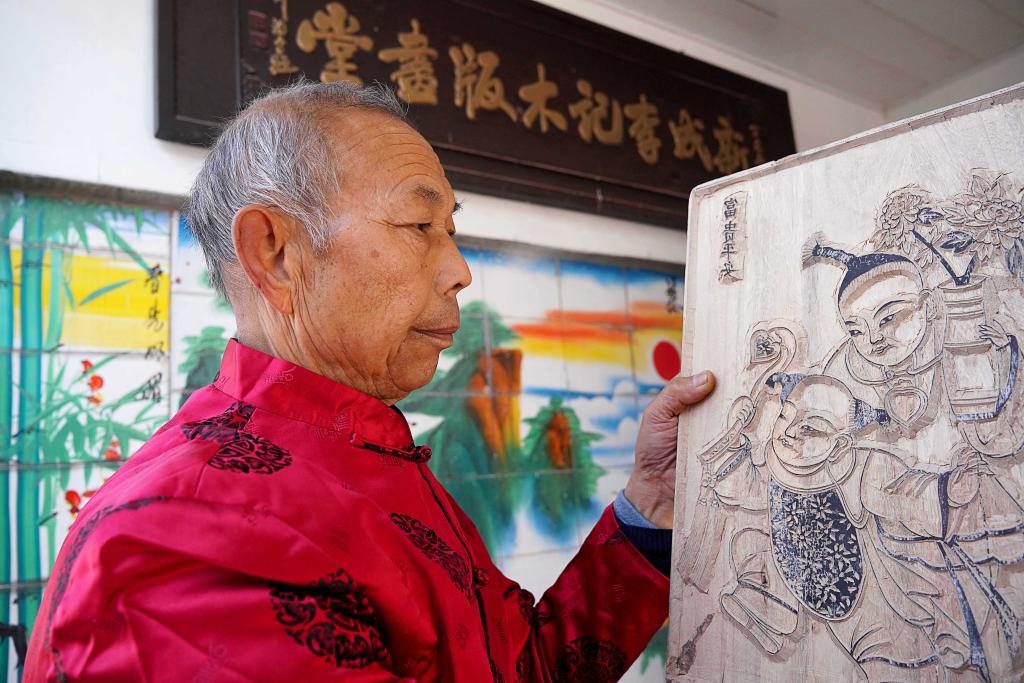 10日、山東省高密市の朱家村で、高密木版年画の代表的伝承者、斉伝新(せい・でんしん)さんが手がける版木。(高密=新華社配信/李海濤)