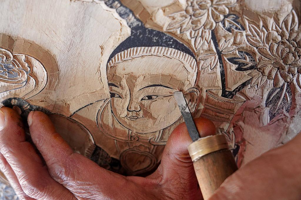 9日、山東省高密市の東李家荘村で、高密木版年画の代表的伝承者、李連中(り・れんちゅう)さんが手がける版木。(高密=新華社配信/李海濤)