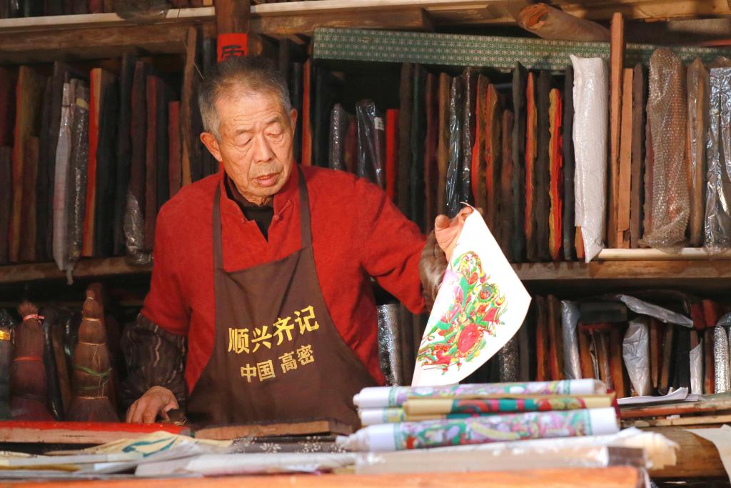 9日、山東省高密市の東李家荘村で、高密木版年画を確認する代表的伝承者の李連中(り・れんちゅう)さん。(高密=新華社配信/李海濤)