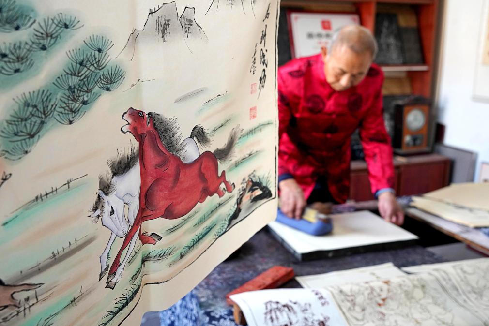 10日、山東省高密市の朱家村で、高密木版年画を制作する代表的伝承者の斉伝新(せい・でんしん)さん。(高密=新華社配信/李海濤)