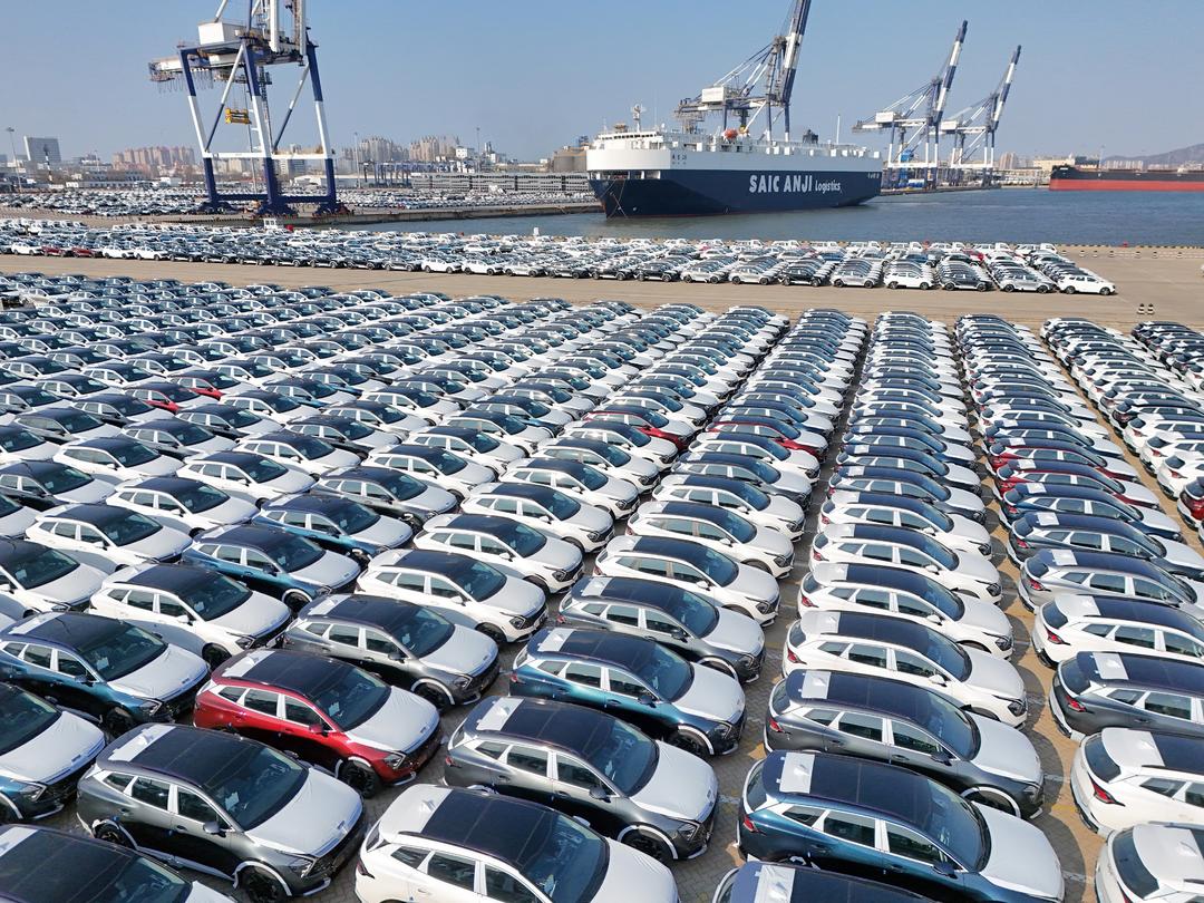 大批国产汽车在山东港口烟台港集结等待装船出口。