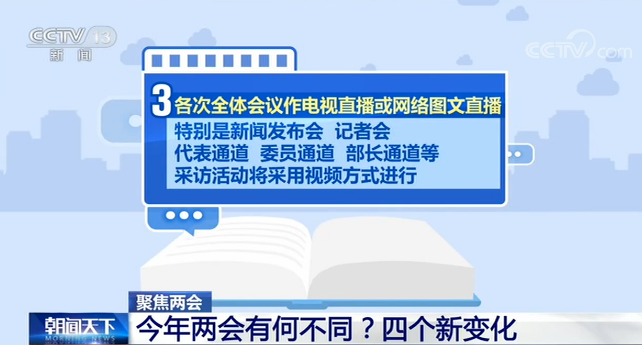 第三,各次全体会议作电视直播或网络图文直播,特别是新闻发布会、记者会、“代表通道”“委员通道”“部长通道”等采访活动将采用视频方式进行。