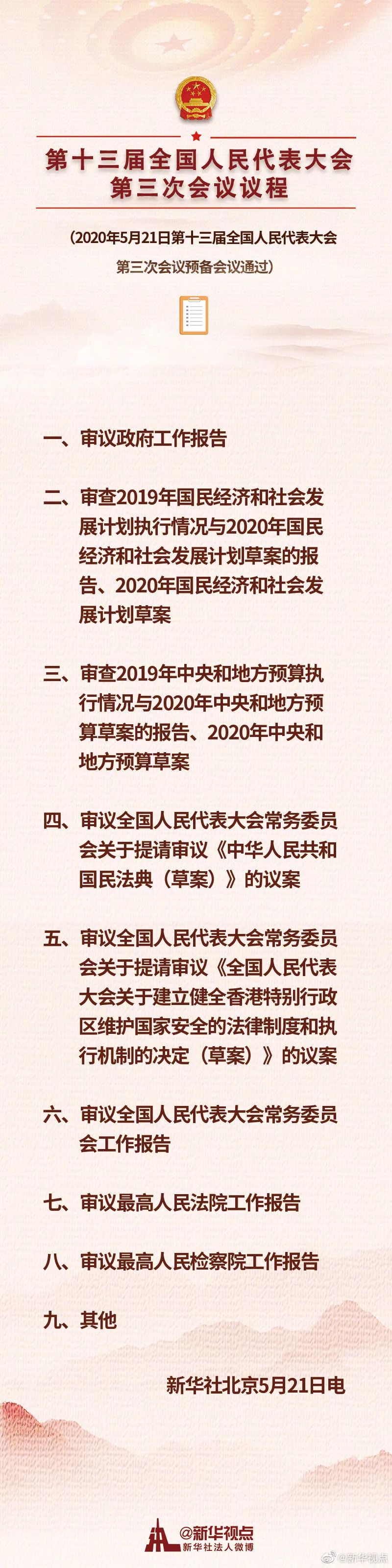 十三届全国人大三次会议21日晚举行新闻发布会。大会发言人张业遂介绍,本次大会22日上午开幕,28日下午闭幕,安排三次全体会议,共9项议程,审议政府工作报告等6个报告,审议民法典草案等,目前各项工作已全部就绪。