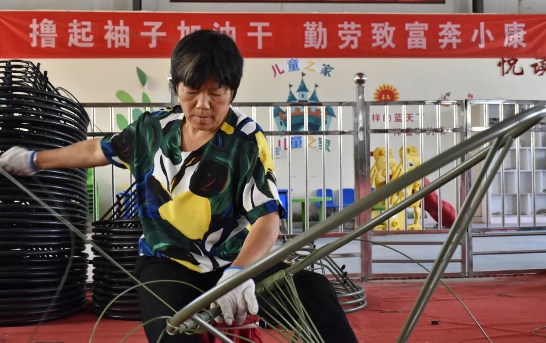 在河南省新蔡县李桥回族镇狮子口村扶贫车间,村民在加工条编椅子。(新华社记者韩朝阳 摄)