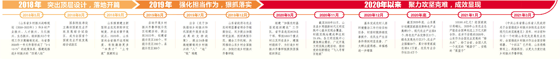 2018年,突出顶层设计,落地开篇;2019年,强化担当作为,狠抓落实;2020年,聚力攻坚克难,成效显现……三年来,山东把打造乡村振兴齐鲁样板摆在重中之重的位置,在干部配备上优先考虑,在要素配置上优先满足,在公共财政投入上优先保障,在公共服务上优先安排,积极探索、扎实推进,集聚各类资源、要素流向乡村、润泽乡村、振兴乡村。