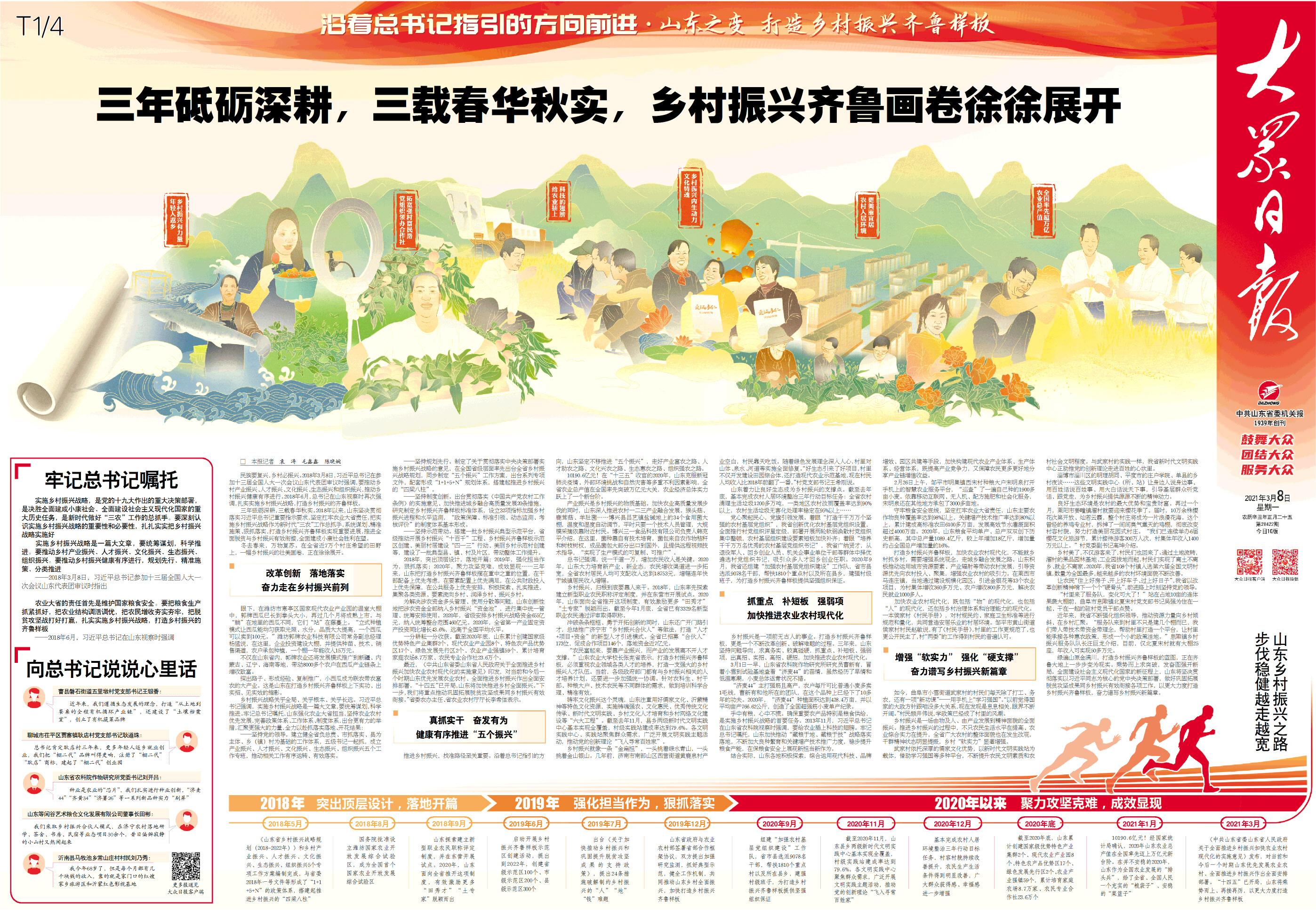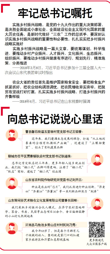 民族要复兴,乡村必振兴。2018年3月8日,习近平总书记在参加十三届全国人大一次会议山东代表团审议时强调,要推动乡村产业振兴、人才振兴、文化振兴、生态振兴和组织振兴,推动乡村振兴健康有序进行。2018年6月,总书记在山东视察时再次强调,扎实实施乡村振兴战略,打造乡村振兴的齐鲁样板。