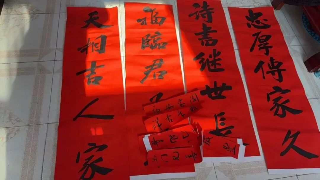 文化传情添年味,笔墨书香送祝福。在新时代文明实践站,返乡大学生化身“文化使者”,参与“迎新春、写福字、送吉祥”主题活动。笔墨翻飞间,一幅幅笔力遒劲的福字、一副副寓意吉祥的春联新鲜出炉,在墨香氤氲中传承中华优秀传统文化,营造了喜庆祥和的春节氛围,让群众在感受年俗魅力的同时,增强了文化认同感和归属感。