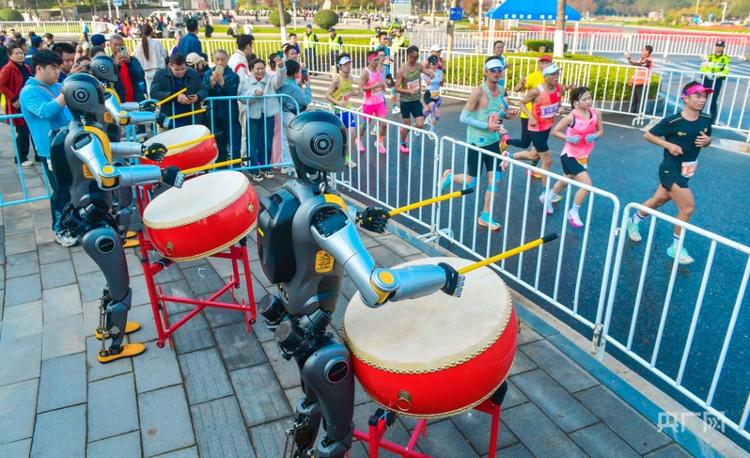 光谷马拉松现场,人形机器人为选手加油(央广网发 光谷马拉松组委会供图)