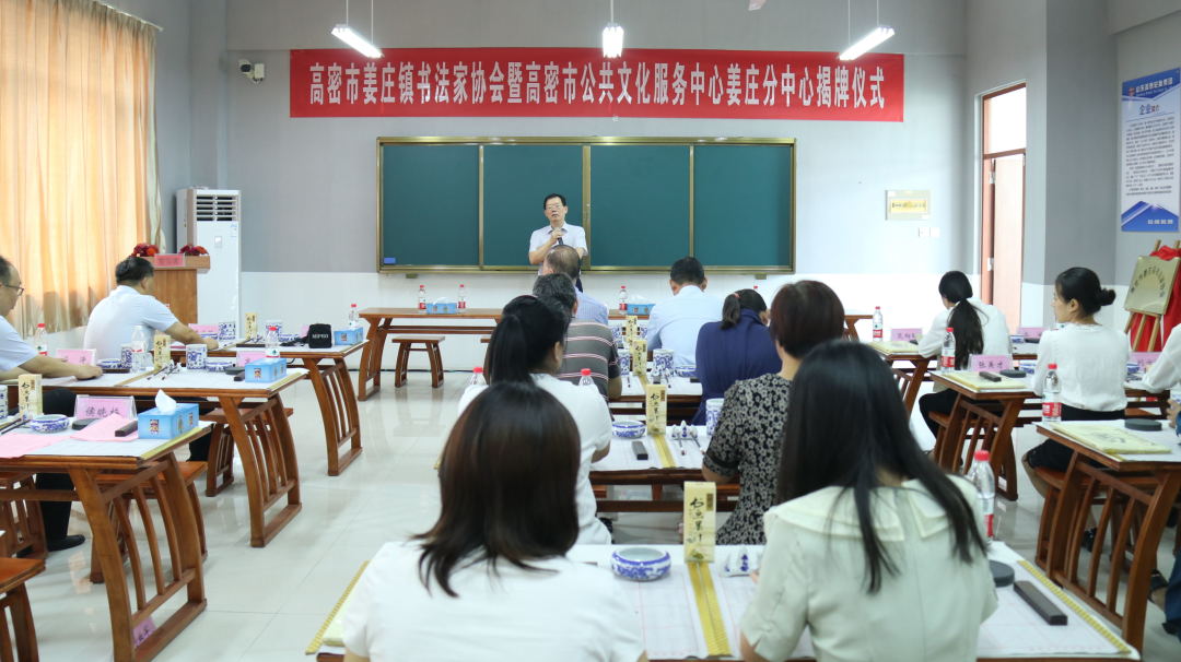 笔墨当随时代,文艺服务人民。为弘扬传统文化、丰富群众文化生活,8月28日,高密市姜庄镇书法家协会暨高密市公共文化服务中心姜庄分中心揭牌仪式在姜庄小学举行。高密市人大常委会副主任施玉梅,市委宣传部副部长、文旅局党委书记、局长于义,市文联党组书记、主席李传洲,姜庄镇党委书记李梅,中国书协学术委员会委员、西泠印社社员王晓光,市文联副主席、市书法家协会主席任成森出席仪式。