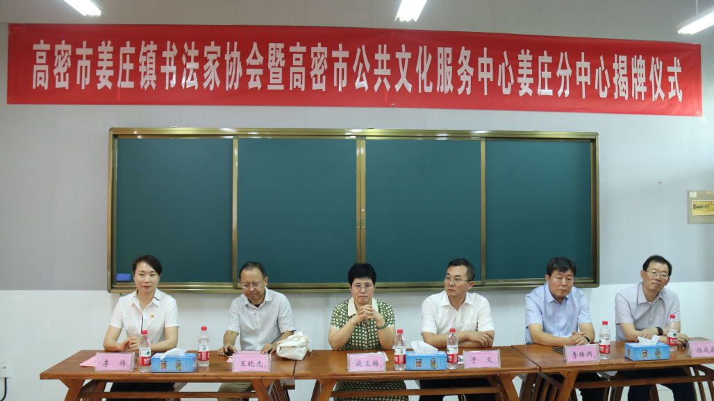 揭牌仪式由姜庄镇中心校校长李云然主持,姜庄镇民政办主任侯艳芹宣读书法家协会备案情况。施玉梅和于义为高密市公共文化服务中心姜庄分中心揭牌,李传洲和李梅为高密市姜庄镇书法家协会揭牌。